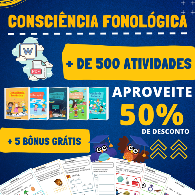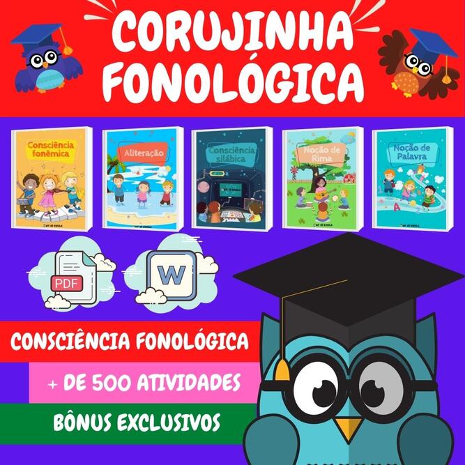 O Fonológica Corujinha oferece 500 brincadeiras em WORD e PDF, cobrindo os níveis da audição das palavras. As tarefas são feitas para serem bem alegres e legais, para as crianças aprenderem fácil e rindo.